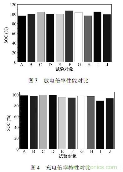 GB/T31486以动力电池在3C电流强度放电来考核其放电倍率;以2C电流强度充电,且充电时长控制在30min内,来考核电池的充电倍率特性。放电倍率特性对比如图3所示;充电倍率特性对比如图4所示。