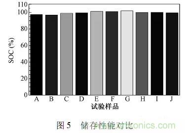 GB/T31486要求动力电池??槌渎纾椅孪乱?C放电30min后,在45±2℃下储存28天,评价电池的容量恢复能力电池样品储存性能对比如图5所示。