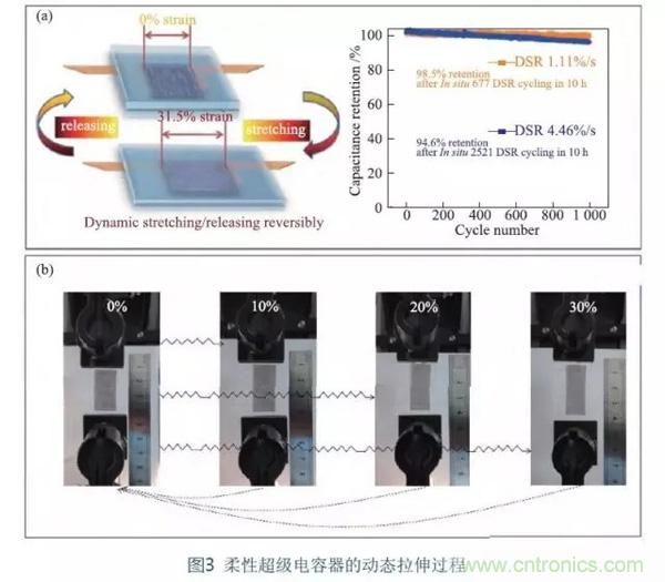 Zang等充分利用石墨烯网状薄膜可与基底紧密结合的特点,获得以预拉伸后的褶皱PDMS为基底、石墨烯网状薄膜为电极材料的可动态拉伸(弯曲)超级电容器。动态拉伸(弯曲)频率可高达60%/s。拉伸过程通过CV曲线进行实时检测,结果表明,动态拉伸(弯曲)过程中未见明显的性能破坏,具有很好的动态变形性能。