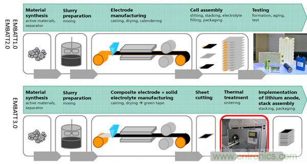 在制造工艺方面,1.0和2.0的制造工艺与现行的锂离子电池制造工艺没有明显区别,在3.0上,由于采用全固态玻璃陶瓷电解液,因此电极和电解质的装配可以在同一步骤完成,省却了后面的注液环节,但是后续增加了热处理环节,主要是为了让电极和固态电解质界面更好的接触。这3.0项目上,全固态电解质的开发、电解质与电极界面兼容性问题是重点研究内容,这与一般的固态电池的研究课题是一致的。