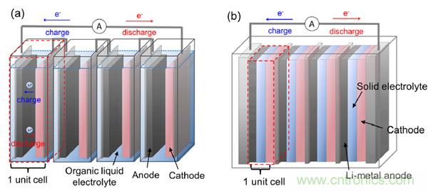 下图对比了传统锂离子电池(a图)和双极性锂电池(b图,这里是以金属锂和全固态为例)。a图中,每个电池单元unit cell包括了正极(一般涂覆在Al基材)、负极(一般涂覆在Cu基材);b图中,每个电池单元unit cell同样包括了正极、负极,但是正极、负极活性材料共用一个基材:当两个电池单元串联起来时,双极性电极的一侧在当前单元电池作为负极,另一侧在相邻单元电池中是作为正极。