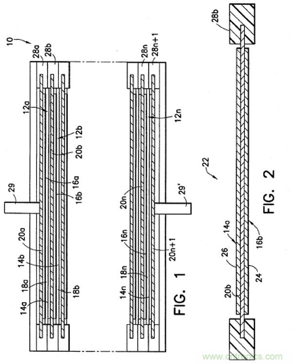 双极性电极的研究早在二、三十年以前就已经出现。例如在20实际九十年代,美国雅迪尼(Yardney)技术公司就对双极锂离子电池展开了研究。双极性电池设计可以将单元电池cell-stack中相邻cell之间的电阻最小化,使得每个双极性cell种的正负极活性涂层表面上的电流和电势达到更加均匀的分布,因此,采用双极性cell构成的电池具有更高的功率特性。下图Fig1是一个典型的由多个双极性电池单元构成的双极性锂离子电池截面图,Fig2是提取出来的其中一个双极性电池单元。其中,12a、12b,…,12n是电池单元;14a、14b,…,14n是电池单元的正极侧;16a、16b,…,16n是电池单元的负极侧;18a、18b,…,18n隔膜;20b、20c,…,20n是集流体(例如,Fig2中的14a和16b共用一个集流体),集流体可采用双金属基材,例如,Cu-Al双金属,负极活性物质涂敷在Cu侧,正极活性物质涂敷在Al侧;24是负极活性物质,26是正极活性物质;28a、28b,…,28n是绝缘性连接固定结构,每个双极性电极通过该连接结构固定起来。在Fig1和Fig2中,一共有n-1个双极性电极(集流体两侧分别有正极、负极活性物质),最上层20a只有负极一侧,另一侧跟负极极柱29相连,最下层20n+1只有正极一侧,另一侧跟正极极柱29相连。