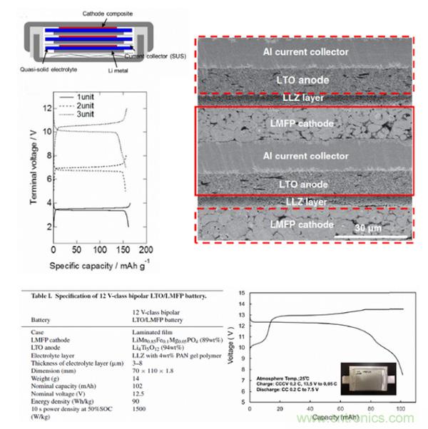 下图是含有三个双极性电极的CR2032钮扣电池。正极是LFP,负极是金属锂,采用准固态聚合物电解质和不锈钢集流体。从电压曲线可以看到,只要改变双极性电极的unit数量,就能改变电池的电压,这里给的分别是1unit、2units、3units的电压曲线。例如,很容易通过5个双极性的unit实现一个12V的锂离子电池,下图右侧是日本东芝公司的一个12V双极性电池的部分截面图,从表1的参数中可以看到,这里正极材料是LiMn0.85Fe0.1Mg0.05PO4,负极材料是LTO,集流体是Al,固态电解质电解质是Li7La3Zr2O12(LLZ)和PAN。从封装方式来看,叠片式软包装是比较适合双极性电池的一种方式。