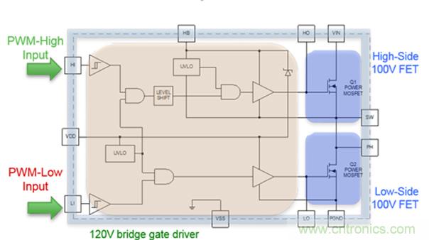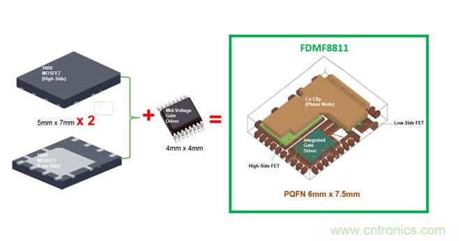 FDMF8811集成了一对100V的功率MOSFET、120 V驱动器IC和一个自举二极管到6.0 mm x 7.5 mm 的PQFN封装。