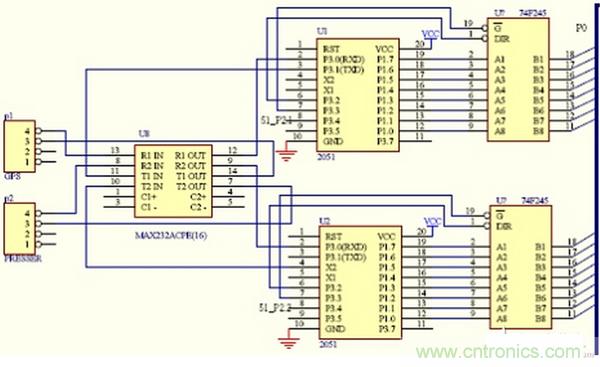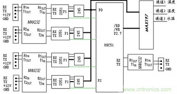 经过分析,我们分别使用一块2051单片机接收各路串口传感器的数据,同时使用一块多路高精度ADC对转换成电压的温度等信号采样,系统结构图如图1所示。主从机之间的具体管脚连接参见图2。