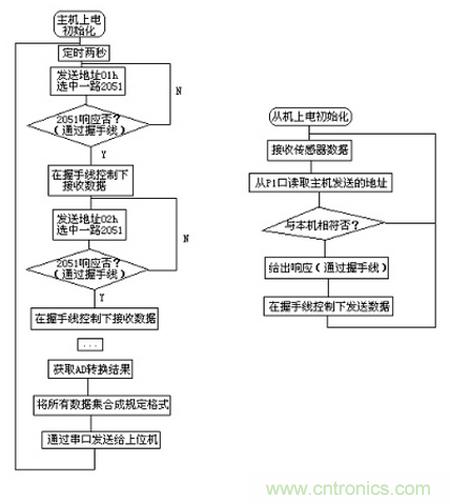 系统中51单片机作为主机控制着整个系统的动作并发起每次通信,每块2051作为实时从传感器获取数据并在主机控制下完成通信。主机和各从机之间通过并口连接通信。主从机工作流程如下: