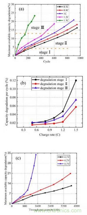 从数据可以看到,随着充电的倍率的加大,锂离子电池的衰降速率也在快速增加,并且从曲线的斜率来看,电池的衰降速度存在三个不同的阶段,前期衰降速度较快的阶段(阶段1),中间衰降速度较慢的稳定阶段(阶段2),和后期的衰降速率加速阶段(阶段3)。针对三个阶段电池的衰降机理的研究认为,阶段1可能是因为电池SEI膜生长需要消耗一部分Li+,因此衰降速度较快。在阶段2随着SEI膜结构的稳定,内部较为稳定,因此衰降速度较慢,在阶段3随着电池老化,开始发生活性物质损失,电极活性界面减少,导致电池对于电流十分敏感。图C是针对不同的截止电压对电池衰降速度影响的实验,从实验结果可以看到,当把充电截止电压提高到4.3V时会导致电池的循环性能急剧恶化,降低充电截止电压可以有效的改善电池的循环性能。