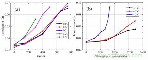 对电池的动态内阻分析如下图所示,从图a测试结果来看,当充电电流小于1C时,电池动态内阻随着电池循环的变化趋势几乎时一样的,但是当充电电流超过1C时,电池动态内阻增加速度会随着充电速率的增加而快速增加。从图b的测试结果来看,当充电截止电压为4.3V时,电池动态内阻增加非常迅速表明高截止电压会恶化电池的动力学条件,截止电压为4.1V和4.2V时电池动态内阻增加较为缓慢。