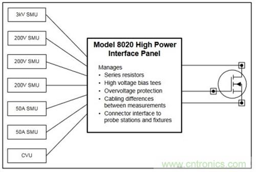 在对功率半导体器件执行全面的DC I-V和C-V测试时,为减少遇到的问题,许多工程师采用高功率接口面板(图3),最大限度地减少主要测量类型之间的连接变化??梢酝ü齌型偏置进行I-V和C-V测量,而不需改变连接,从而减少用户出错的机会。