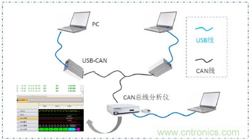 下面进入重点,如果两个节点ID段相同会怎样?我们用两个CAN卡 和一台CANScope开始实验,CAN卡模拟CAN标准节点收发报文,CANScope做通信监控,如图2所示。(注:CAN卡为USB转CAN工具,CANScope为CAN总线分析仪,产品详见ZLG致远电子官网)