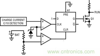 前述电路的方框图如图 1 所示。该电路基于一个 D 触发器。随着充电电流值降至预设定的 C/10,D 触发器时钟变为高电平,外部晶体管 Q1 将 RUN 引脚拉至地,并关断 LTC4012。电池充电,电压接近最大值。随着充电器关断,电池开始放电,最终达到最小电压,D 触发器清零,然后 Q1 关断,充电周期重复。