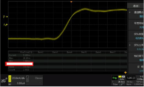 测试电流探头的上升时间使用的测试仪器是信号发生器Keysight33600和示波器ZDS2022。信号发生器产生上升时间为5ns的方波,示波器显示经过电流探头后的上升波形和时间。