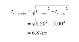 如图3.1所示,根据示波器测量到的上升时间为8.5ns,这个总时间是信号发生器自身的上升时间加上探头的上升时间,所以实际上探头的上升时间还需要将总时间减去信号发生器自身的上升时间,具体的计算公式如下。