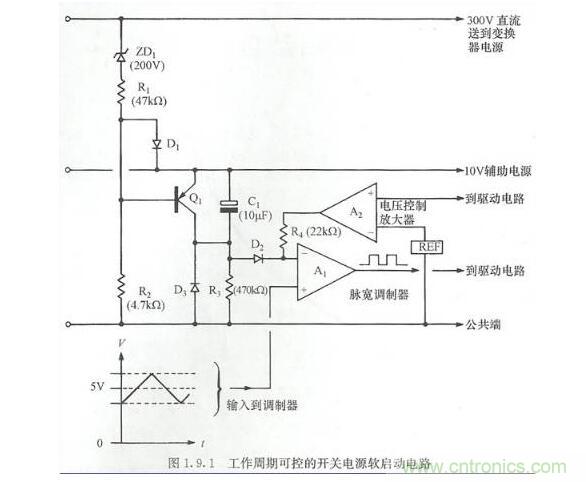 此时ZD1将开始导通,而Q1将关断。C1将通过R3充电,使A1的反相输入端电压拉向零状,并允许脉宽调制器的输出向驱动电路提供逐渐增大宽度的脉 冲,直到形成所需的输出电压。 当正确的输出电压建立后,放大器A2控制了放大器A1反相输入端的电压。C1将继续通过R3充电,使二极管D2反向偏置并使C1不再受调制器的影响。当 开关电源关断后,C1将很快地通过D3放电,为下一次的启动动作重新设置C1.在输入电压较高时,D1可防止Q1被大于正向二极管压降的电压反向偏置。