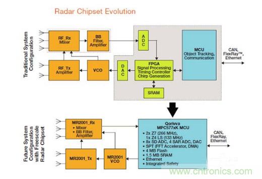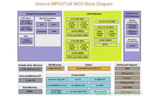 QorivvaMPC567xK系列基于Power Architecture® 的32位MCU,MPC577XK是专门的雷达信息处理芯片,该系列增加了芯片的存储器,提升了运行速度和性能,能够支持自适应巡航控制、智能大灯控制、车道偏离警告和盲点探测等应用。从整个雷达系统来看,结合77G雷达收发器芯片组、Qorivva MPC567xK MCU、FPGA, ADC, DAC, SRAM, 支持长、中、短距离应用。这里需要重点关注的是信号处理工具集(Signal Processing Toolbox)设计,包括了FFT、DMA、COPY、Scheduler。目前77GHz的FCMW型雷达在数字信号处理中需要使用FFT,即快速傅里叶变换,一般车载雷达的采样点在512-2048左右,从芯片架构图我们看到专门的FFT电路。