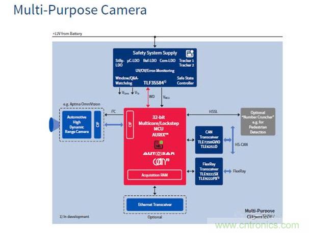 Visiconti采用多核异构的专用处理器,Visconti2可实时处理,并行实现4项功能,如车道保持、前车检测、行人辨识、交通标志辨识。Visconti4图像识别处理器可轻松对车辆和行人加以辨识,对交通信号、障碍物、行车线等信息加以识别,从而实现各种高级的驾驶员辅助应用,如入车道偏离警告、前方/后方防撞警告、前方/后方行人防撞警告、交通标识识别等,能同时处理并实现8项功能。