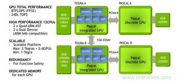 NVIDIA推出的Drive PX2被黄仁勋称为“为汽车设计的超级电脑”,它将成为汽车的标准配备,可以用来感知汽车所处位置、辨识汽车周遭的物体,并且即时计算最安全的路径。“Tegra X1处理器和10GB内存,能够同时处理12个200万像素摄像头每秒60帧的拍摄图像,并通过环境视觉计算技术和强大的深层神经网络,主动识别道路上的各种车辆,甚至还能检测前方车辆是否在开门。Driver PX2还搭载了其他合作伙伴的芯片,包括Avago的PEX8724(24-lane,6-port,第三代 PCIe Gen交换机)用于两块Parker之间的互联?;褂幸黄⑻囟展旱腁ltera提供的FPGA,用于执行实时操作系统。FPGA的型号为Cyclone V 5SCXC6,是Altera的顶级产品,逻辑运算为110K,注册器达166036。最后还有一款英飞凌的AURIX TC 297 MCU做安全控制,据说可以让PX2达到ASIL C级水平。 还有博通的BCM89811低功耗物理层收发器(PHY),使用BroadR-Reach车载以太网技术,在单对非屏蔽双绞线上的传输速率可达100Mbps。所以NVidia实际上推出了板级的ADAS系统。