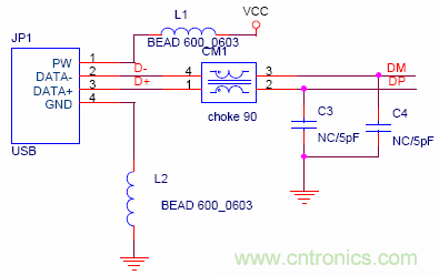 USB 高速运行会在DM/DP信号线上产生很强的共模干扰