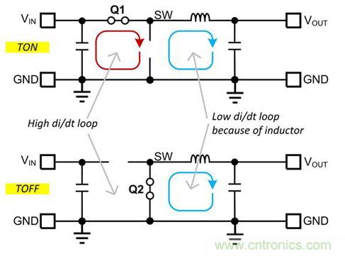 图 1. 降压转换器中的电流环路。VIN 环路为高 di/dt 环路。