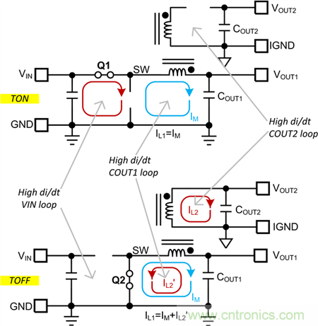 图 2. Fly-Buck 转换器在一次侧有两个高 di/dt 环路。所有二次环路都是高 di/dt。