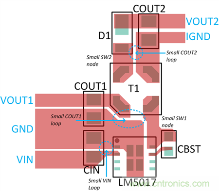 图 3.基于 LM5017 的 Fly-Buck 布局可对 di/dt 环路和高 di/dt SW1,2 节点面积进行最小化。