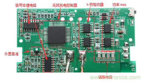 这种SoC方案下,PCB上只有一颗大芯片,和两个MOS管,相当简洁。SOC内部集成了无线充电驱动,H桥驱动器,运放,内置温度保护功能等,一颗芯片实现所有功能,可有效控制成本和精简生产流程。