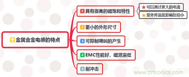 对于金属合金构造的电感来说,因为形成线圈的磁性材料是微粒的,所以磁场较分散;一体成型构造也能够控制线材的振动,从而很难产生啸叫问题。