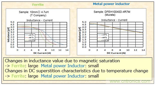 同时,针对温度的变化,金属合金粉材质的电感衰减比铁氧体要缓慢很多。