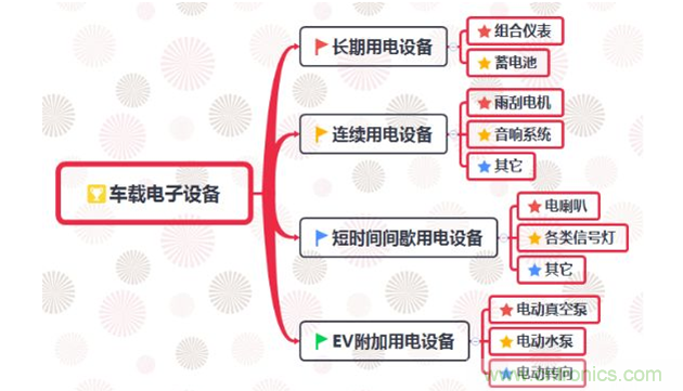 作为电动汽车的供电设备,DC/DC变换器也给车载电子设备供电。根据纯电动汽车车载电子设备不同属性,可把用电设备分为长期用电设备、连续用电设备、短时间间歇用电设备和EV附加用电设备等四种类型,如下图所示。同时,DC/DC变换器的体积和种类都很小且输出稳定。
