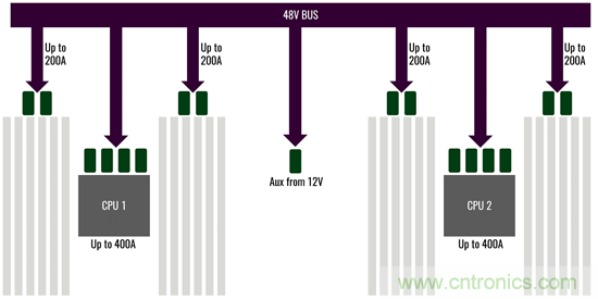 例如,在有两个VR13-HC处理器和两个DDR内存条的应用中,每个处理器需要高达400A的电流,每个内存条需要200A电流。