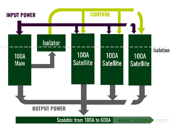 图字:输入电源;控制;100A主模块;隔离器;100A从???;隔离;输出电源;从100A到600A可扩展