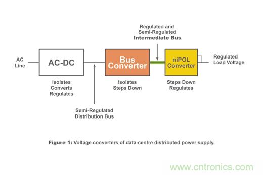 图字:交流线路;隔离、转换、稳压;半稳压配电总线;总线转换器;隔离、降压;稳压半隔离中间总线;niPOL转换器;降压、稳压;稳定负载电压