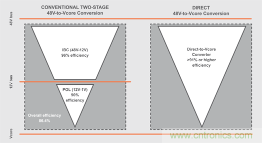 图字:12V总线;48V总线;传统的两级48V至Vcore转换;IBC(48V-12V);96%效率;POL(12V-1V);90%效率;总效率为86.4%;直接48V至Vcore转换;直接至Vcore转换器;>91%或更高的效率