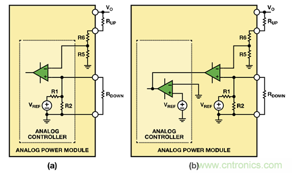 图2. 利用 (a) 带有可配置内部基准电压的模拟控制器,或者(b) 带有固定内部基准电压的模拟控制器调整模拟电源模块的输出电压