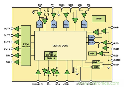对于数字控制器来说,所有的控制功能均由数字逻辑实现。图3所示为集成PMBus接口的高级数字控制器ADP1051的功能框图。该器件非常适合高密度DC-DC电源转换,具有6个可编程脉冲宽度调制 (PWM) 输出,可控制大部分高效电源拓扑。另外,该器件还能控制同步整流 (SR),并集成6个模数转换器 (ADC),能够采样模拟输入电压、输入电流、输出电压、输出电流、温度以及其它参数。转换为数据后,将这些信号发送至数字内核模块进行处理。该器件采用灵活的状态机架构,以硬件实现全部功能,提供稳定可靠的解决方案,但无法通过编程实现设计以外的功能。器件的全部功能—包括输出电压调整—均以数字方式处理。为了调整输出电压,应通过PMBus接口发送一条命令,改变数字基准电压值。