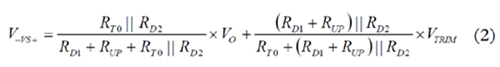 其中,VO是电源??榈氖导适涑龅缪?。采用标准反馈网络,则输出电压无法以模拟方式调整。如图4所示,通过加入RUP、RT0和VTRIM的方式重新配置反馈网络可对比例输出电压进行调节。于是,检测电压为: