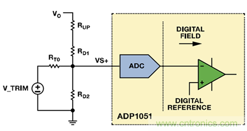 考虑整个控制环路,输出电压通过电压分压器或者运算放大器缩放到合适的值,然后输入给VS+引脚。VS+引脚。ADC对该电压进行采样。数字内核知道数字化的输出电压值和通过PMBus接口设置的数字基准电压。数字比较器和补偿滤波器将数字基准电压与检测到的比例输出电压进行比较,产生误差信号以控制PWM,处理方式与模拟控制器相同。不幸的是,数字比较器只能通过PMBus使用数字基准电压。数字比较器、数字基准电压以及数字补偿滤波器均只采用逻辑电平信号工作,因此无法使用外部基准电压并旁路内部比较器和滤波器。受限于这种固定的硬件配置,向后兼容现有模拟调整功能的唯一途径是调节VS+引脚上的ADC检测电压。一种方法是重新配置反馈网络。