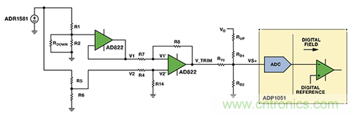 图5中的电路具有兼容模拟向上或者向下调压的功能。两个电阻分压器产生两个基准电压,其中一个基准电压表示模拟控制器所需的输出基准电压,另一个表示内部基准电压。利用一个电压跟随器来避免所需的输出基准电压与后续电路相互影响。利用AD822 FET输入运算放大器,将所需的输出基准电压 (V1) 从模拟控制器的内部基准电压 (V2) 中去除,得到所需的电压差。此电路的线性放大增益确保了VTRIM足够大,从而能对VVS+产生影响。