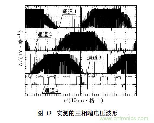 图13为实测的三相端电压波形(通道1~通道3) ,通道4的上升沿和下降沿分别对应过零点和换相点.
