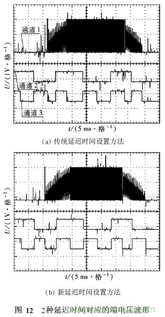 2种延迟时间设置方法对应的实测端电压波形(通道1)如图12所示,通道2和通道3为过零点检测波形,通道2的上升沿和下降沿对应于过零点,而通道3的上升沿和下降沿分别对应过零点和换相点.