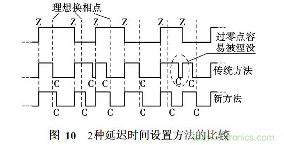 采用传统的延迟时间设置方法,某些换相点偏离理想换相点较大. 当某次换相严重滞后时,下次过零点容易被湮没,导致电机失步,如图10所示.