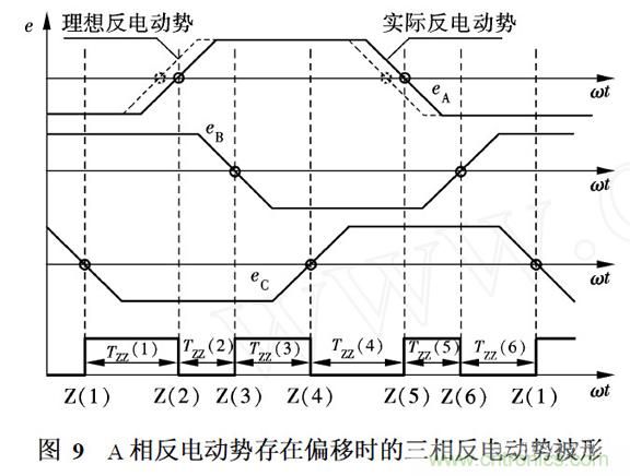 假设A 相反电动势存在相位偏移, 波形上升和下降部分上的过零点滞后出现,导致过零点在时间轴上分布不均匀. 如图9所示, 虚线表示理想反电动势,实线表示存在相位偏移的实际反电动势,过零点的间隔时间TZZ (1) , TZZ ( 2)和TZZ ( 3)不相等. 每相反电动势波形上升和下降部分的2个过零点相差180°电角度, 过零点间隔时间存在着周期性规律,如TZZ ( 1) =TZZ ( 4) , TZZ ( 2) = TZZ ( 5)和TZZ (3) = TZZ (6) .
