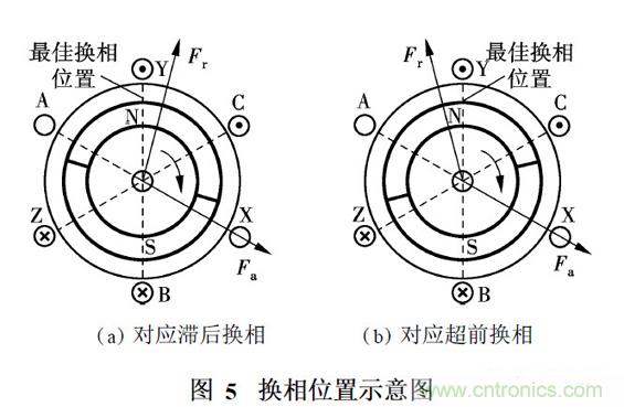 最佳换相逻辑是指绕组在梯形波反电势的平顶部分导通, 与之对应的最佳换相位置是指在换相完成后,定子磁势超前转子磁势120°电角度,如图5所示. 其中, Fa 和Fr 分别表示定子磁势和转子磁势. 在一个工作状态内定子磁势平均超前转子磁势90°电角度,平均电磁转矩最大.