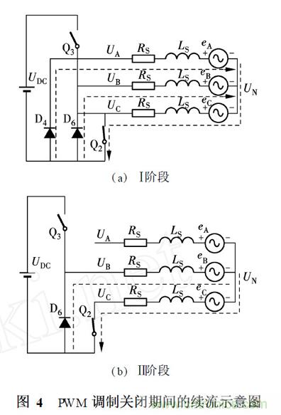 AC 和AB 区为A 相上桥臂开关PWM 调制阶段. 以AC区为例,在PWM 开通期间, Q1 和Q2 导通, A 相绕组与直流侧电压的正极相连, 端电压为UDC ;在PWM 关闭期间, Q1 关闭, Q2 导通,由于绕组阻抗呈感性, A 相下桥臂的反并联二极管D4 导通续流,此时A 相绕组与直流侧电压的负极相连,端电压为零.