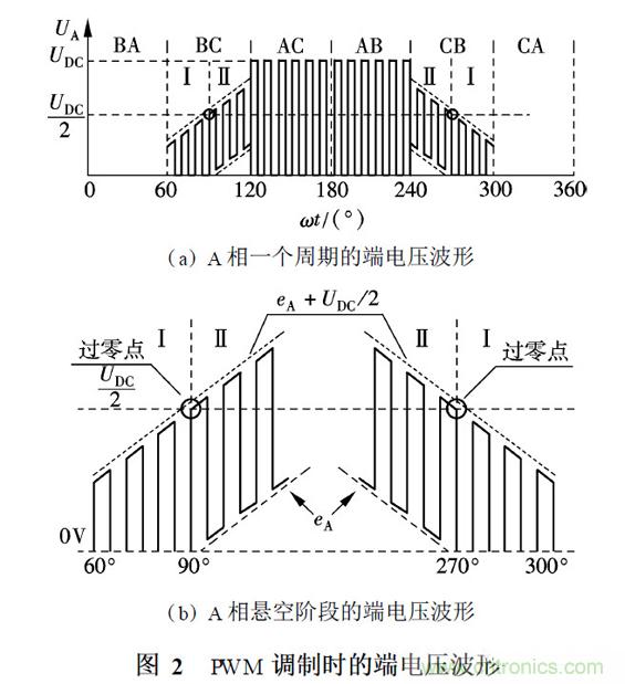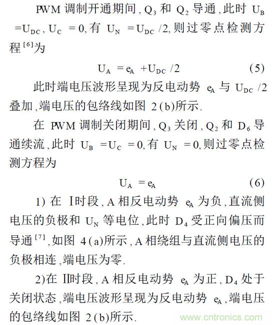 【导读】分析了上桥臂PWM 调制、下桥臂恒通调制方式时的端电压波形,讨论相应的反电动势过零点检测方法。在PWM 调制信号开通状态结束时刻对端电压进行采样,由软件算法确定反电动势过零点. 针对电机运行时存在超前换相或滞后换相的情况,通过设置合理的延迟时间来实现最佳换相。