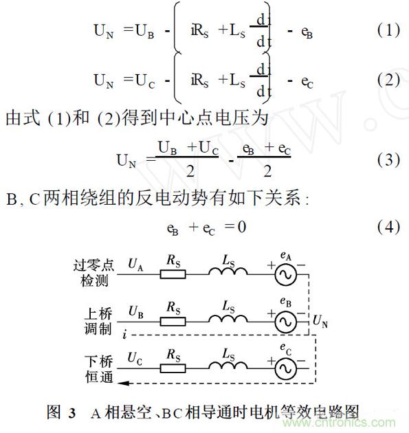 1) 反电动势法通过检测端电压获得反电动势过零点,设置延迟时间得到换相点. 本文采用软件算法获得过零点和换相点, 简化了硬件电路, 适用于低成本应用.