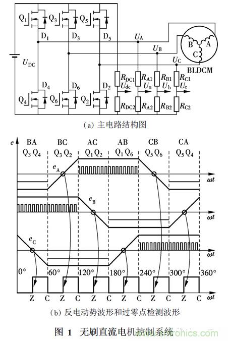 理想的反电动势波形为正负交变的梯形波,且以电机中心点为参考点,图1 ( b)中, eA , eB , eC 分别表示三相反电动势. 电机在一个周期内共有6个工作状态,每隔60°电角度工作状态改变一次, 每个功率开关导通120°电角度. 工作状态可以由导通的两相绕组和2个功率开关表示,如图1 ( b)所示,BA 表示电流从B 相绕组流入,从A 相绕组流出;Q3Q4 表示B 相上桥臂和A 相下桥臂的2个功率开关导通. 过零点检测波形表示反电动势过零点和换相点, 其中, Z为反电动势过零点, C 为换相点.反电势过零点和换相点均匀分布,彼此间隔30°电角度.