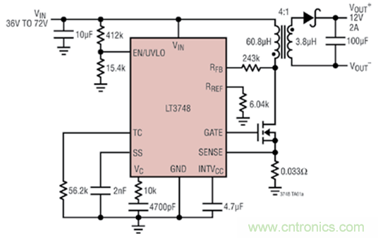 图 1:采用主端输出电压检测的 LT3748 反激式转换器。