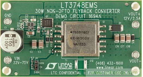 图 3 示出了一款采用 LT3748 的演示电路板。该电路可接受一个范围从 22V 至 75V 的 输 入 电 压, 并 在 高达 2.5A 的电流条件下产生一个隔离型12V 输出。