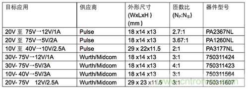 凌力尔特公司与主要的磁性元件制造商进行了合作,以生产供 LT3748使用的预设计型反激式变压器。表 1是一张缩略表,罗列了一些推荐使用的市售变压器,制造商为 Wurth Electronics和 Pulse Engineering 公司。完整列表请见 LT3748 的产品手册。这些变压器一般能够承受 1,500VAC 的主端至副端击穿电压(持续时间为一分钟)。也可以使用击穿电压更高的变压器和定制变压器。